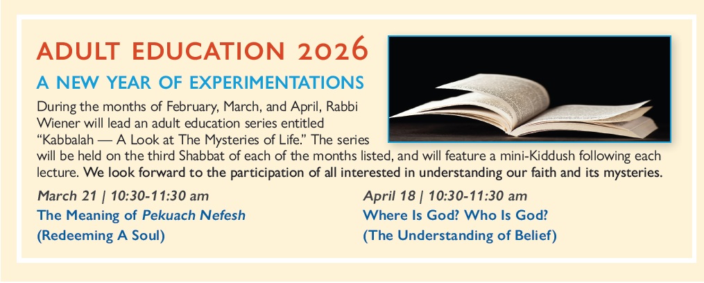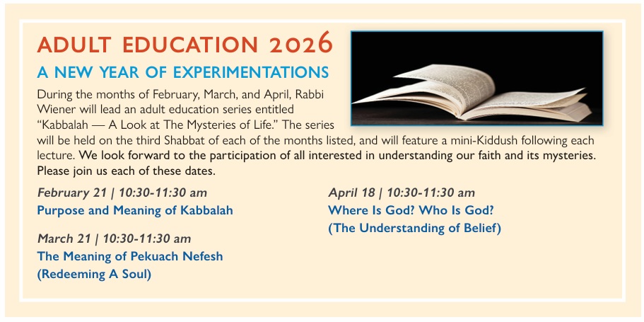 Once again Rabbi Wiener will be leading our congregation in a series of inspiring adult classes this fall. This is a wonderful opportunity to hear and learn first hand information that will bring thoughtful information to everyone. You will come away with a feeling of fulfillment and inspiration.