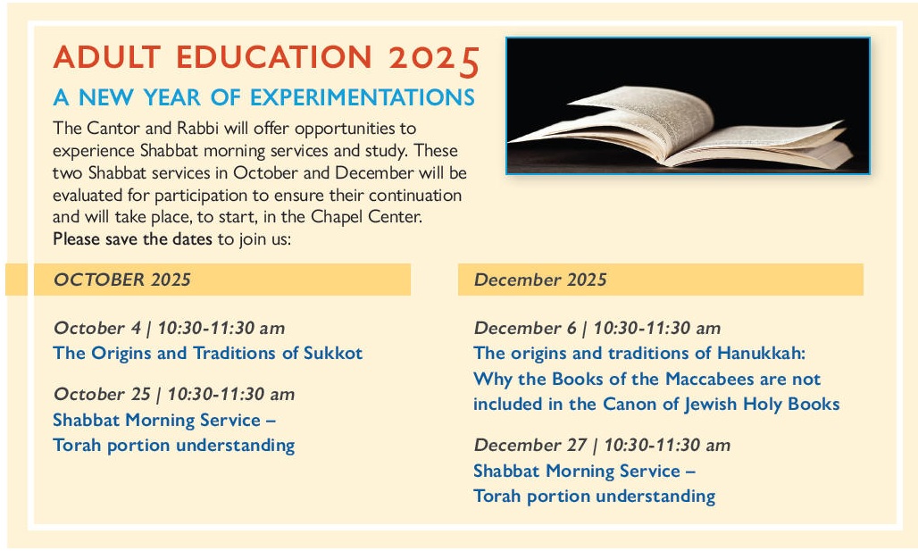 Once again Rabbi Wiener will be leading our congregation in a series of inspiring adult classes this fall. This is a wonderful opportunity to hear and learn first hand information that will bring thoughtful information to everyone. You will come away with a feeling of f-ulfillment and inspiration.