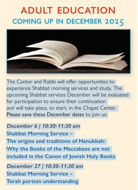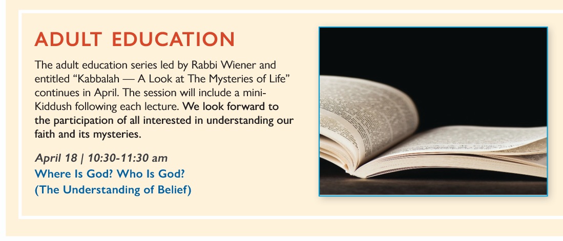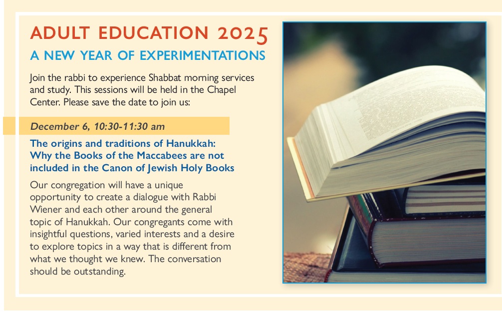 Once again Rabbi Wiener will be leading our congregation in a series of inspiring adult classes this fall. This is a wonderful opportunity to hear and learn first hand information that will bring thoughtful information to everyone. You will come away with a feeling of fulfillment and inspiration.